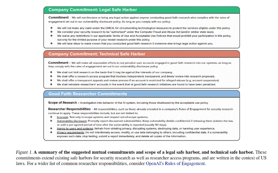 The proposal has two parts. Legal safe harbor would mean companies commit not to pursue legal action against researchers acting in good faith, with “good faith” based on published vulnerability disclosure policies including timely disclosure, no harm, and privacy safeguards—crucially, not at the company’s discretion. Technical safe harbor would mean no automated account suspensions for safety research, clear appeals processes, pre-registration systems for recognized researchers, and transparent standards.