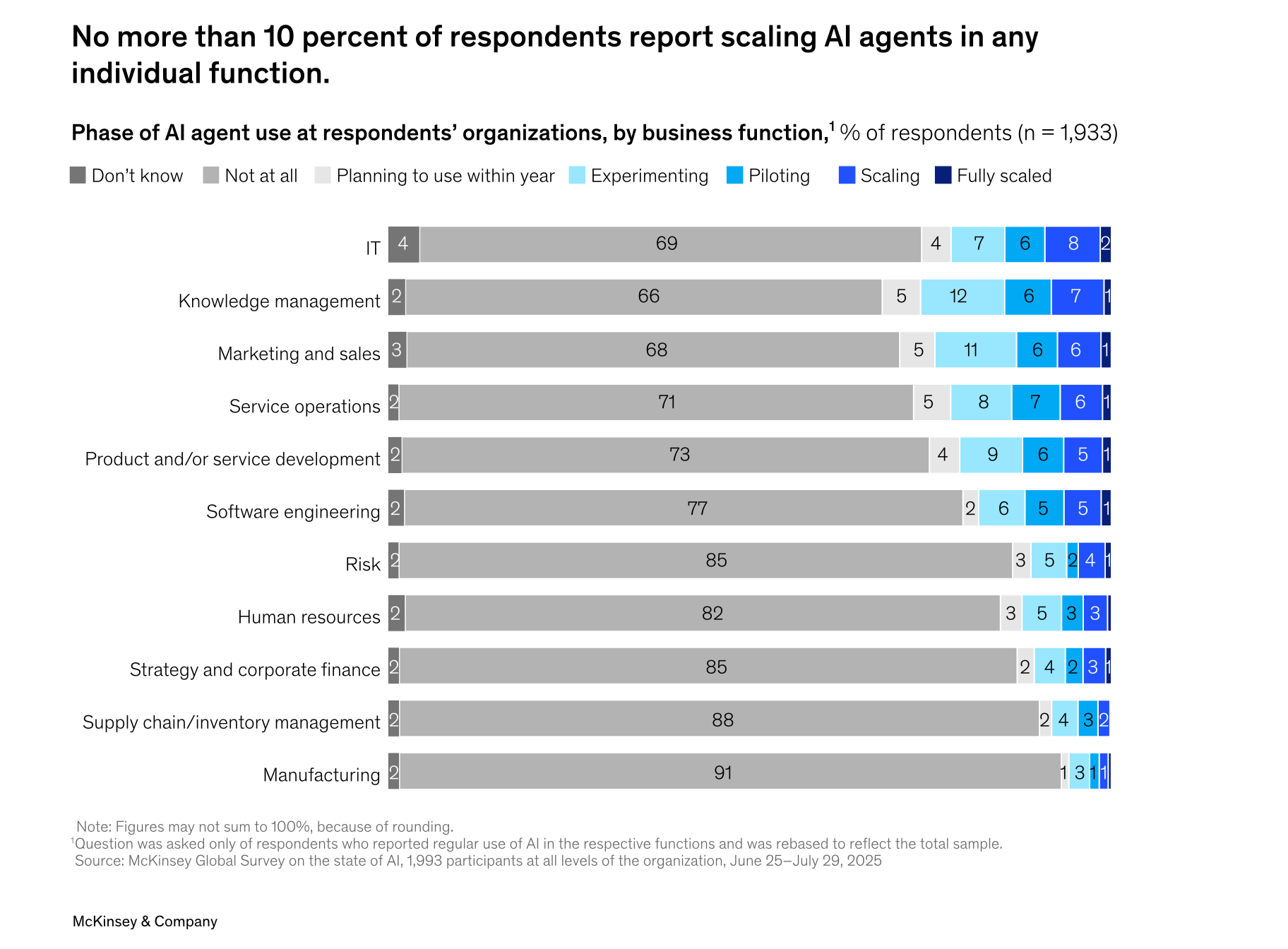 But use of agents is not yet widespread, where in any given business function, no more than 10 percent of respondents say their organizations are scaling AI agents.