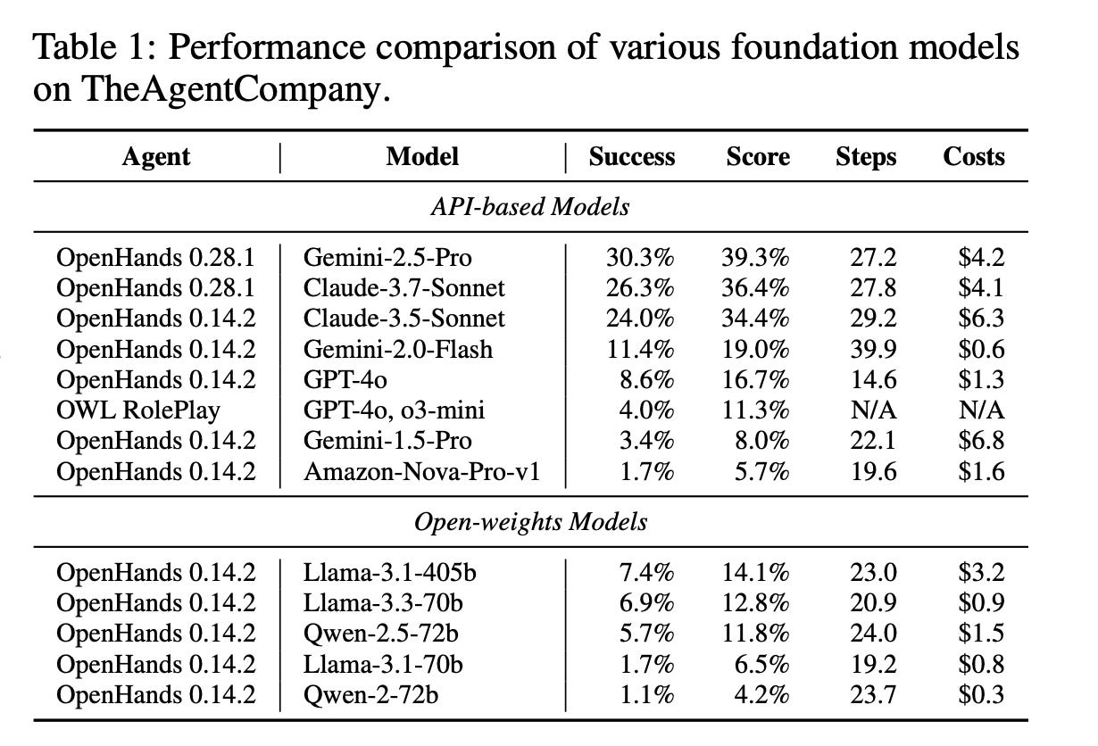 In late 2024, researchers at Carnegie Mellon University created “TheAgentCompany,” which is a simulated software company designed to benchmark how well AI agents can perform real office work. They gave agents tasks that knowledge workers do every day like browsing websites, writing code, managing projects, communicating with colleagues.
