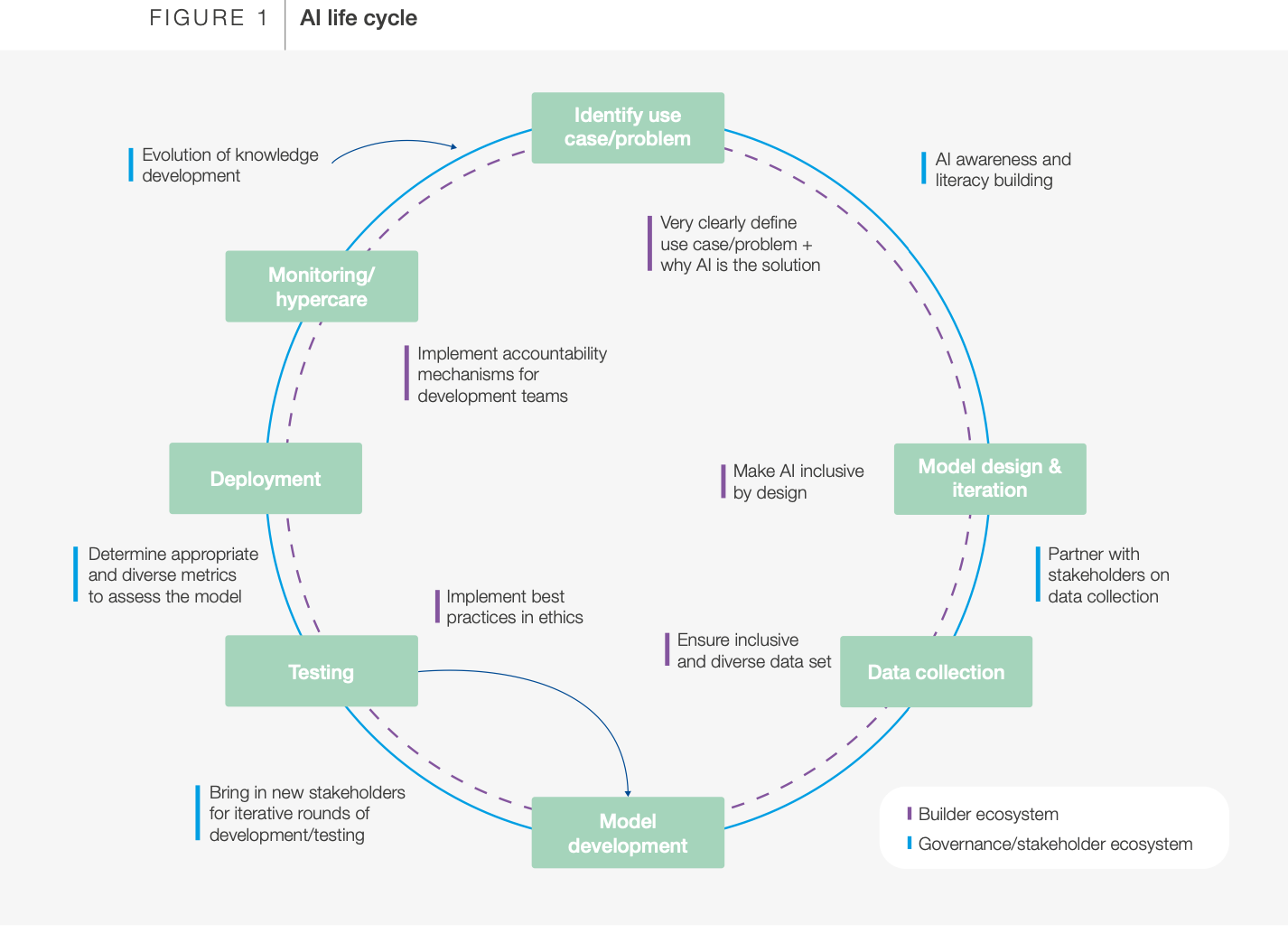 The World Economic Forum focuses its equity framework on organizations, rather than laws, to achieve “equitable and inclusive artificial intelligence outcomes” in their 2022 report, A Blueprint for Equity and Inclusion in Artificial Intelligence.